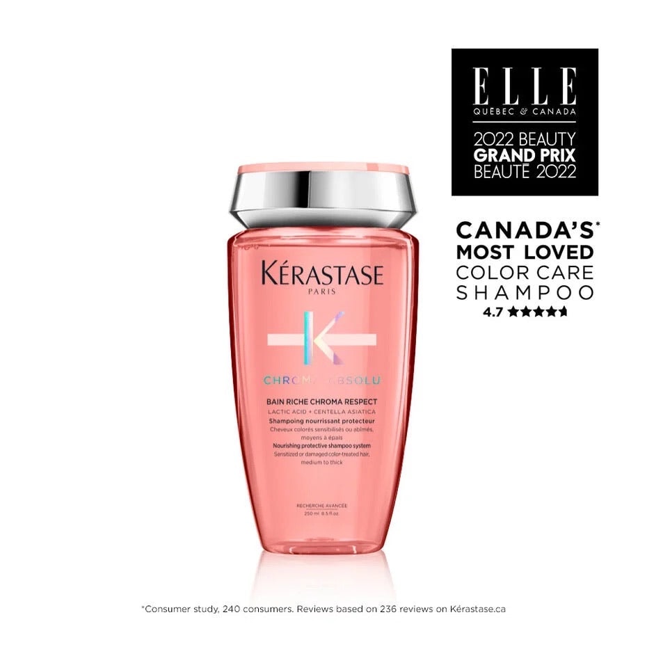 Bain Riche Chroma Respect is a rich, nourishing and protective sulfate-free shampoo for colored hair. This hydrating shampoo for colored hair cleanses and nourishes hair while preserving hair color from fading away or discoloring. Enriched with Lactic Acid and Centella Asiatica, this shampoo helps to seal hair fiber porosity, smoothing the surface for maximum color retention and less color induced frizz. Hair is 95% more nourished*, stronger and reflecting 65% more brilliant bright shine**. Hair fiber so healthy that 92% of color intensity is preserved after 6 weeks***. A sulfate-free, paraben-free and silicone-free shampoo. 9/10 women agree that the hair feels nourished and moisturized, and look healthy****.