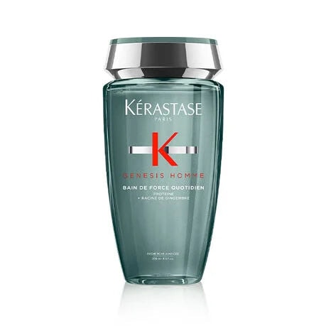 Energize and strengthen your hair from the first wash with Kérastase Genesis Homme Bain de Force Quotidien Shampoo, a purifying and fortifying daily shampoo formulated specifically for men. Enriched with Creatine, Ginger Root Extract, and Menthol, this invigorating gel cleanser removes impurities and excess oil while reinforcing the hair fibre to help prevent breakage. The scalp feels refreshed, hair looks thicker, and strands feel stronger — clean, light, and full of vitality.