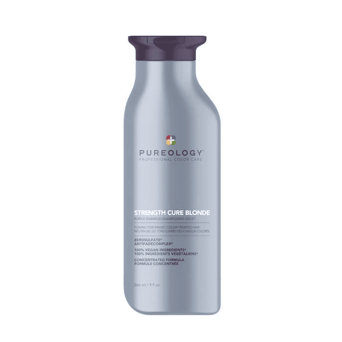 PUREOLOGY Strength Cure Best Blonde Shampoo is a rich lather purple shampoo that tones and fortifies brassy, damaged and lightened hair.